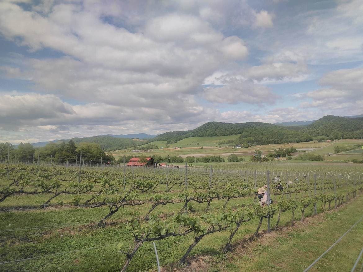 私たちのワイナリーは、直売所と醸造所が同じ建物になっています。そして、ワイナリーの隣には私たちが管理しているぶどう園が広がっています。